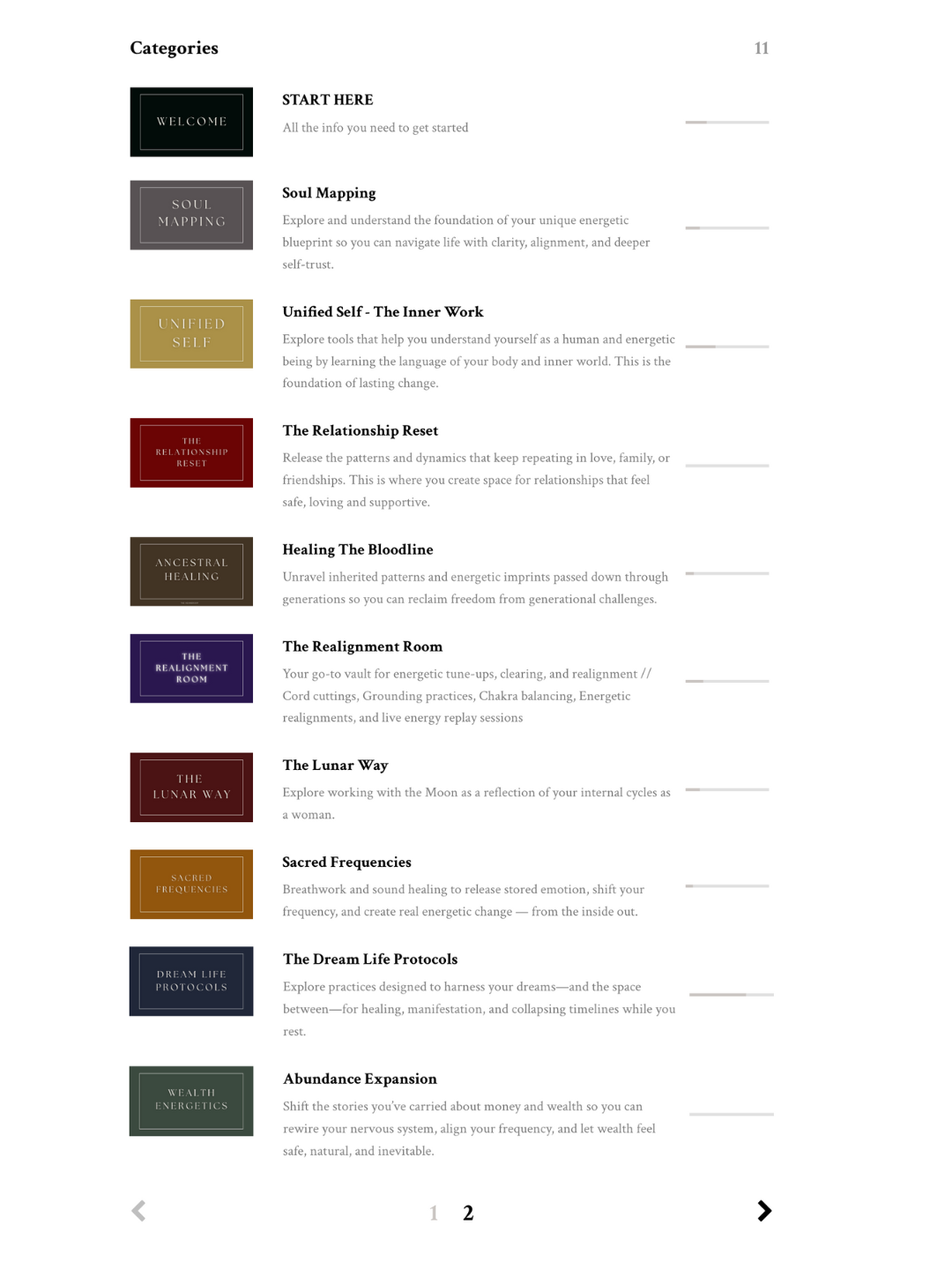 You'll find over 100 lessons in different categories, designed to support your life journey and anything you want to attract or align with, in your life. Dive in at your own pace, or follow along monthly.